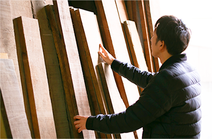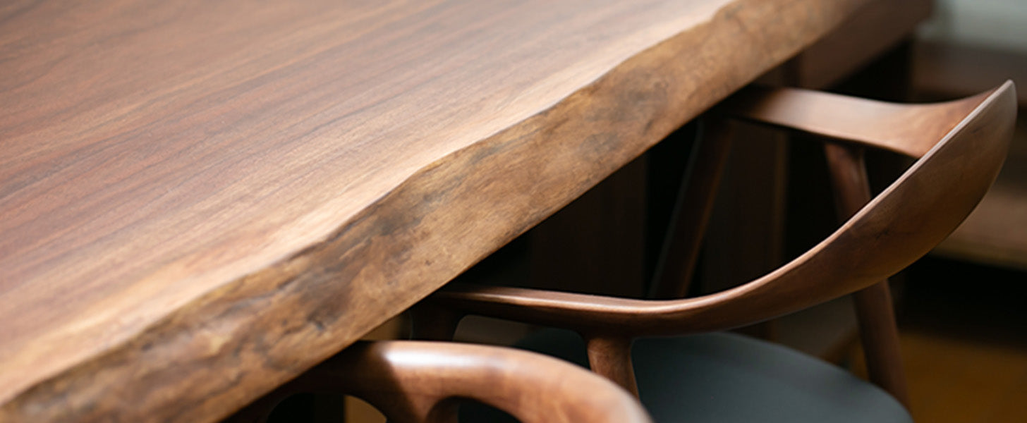 モンキーポッド、ウォールナット、タモ、オーク、ブラックチェリー、メープル、ヒノキなど、職人が目利きした良質な無垢材を種類豊富に取り揃え。一枚板から接ぎ板、集成材まで、お客様のご予算やニーズに合った資材で製作いたします。