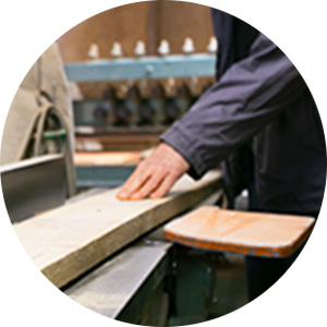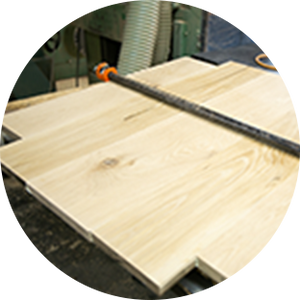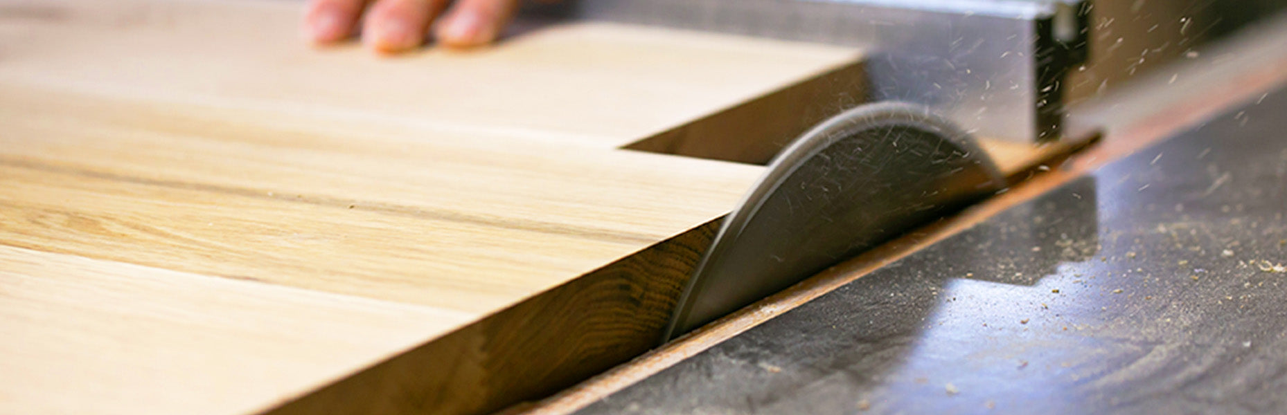 まずは、テーブルの天板づくり。無垢材をカットし、板を複数作ります。木下家具では、天然乾燥と人工乾燥のしっかりと乾燥をした無垢材を使用するのが、こだわり。料理の“したごしらえ”のようなもので、水分をしっかりと抜くことで変形や反りが少なくなります。